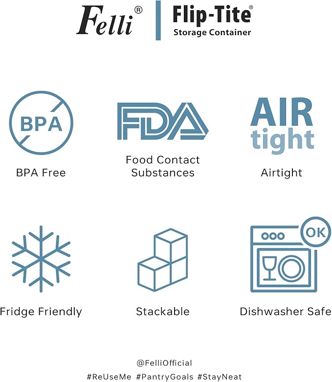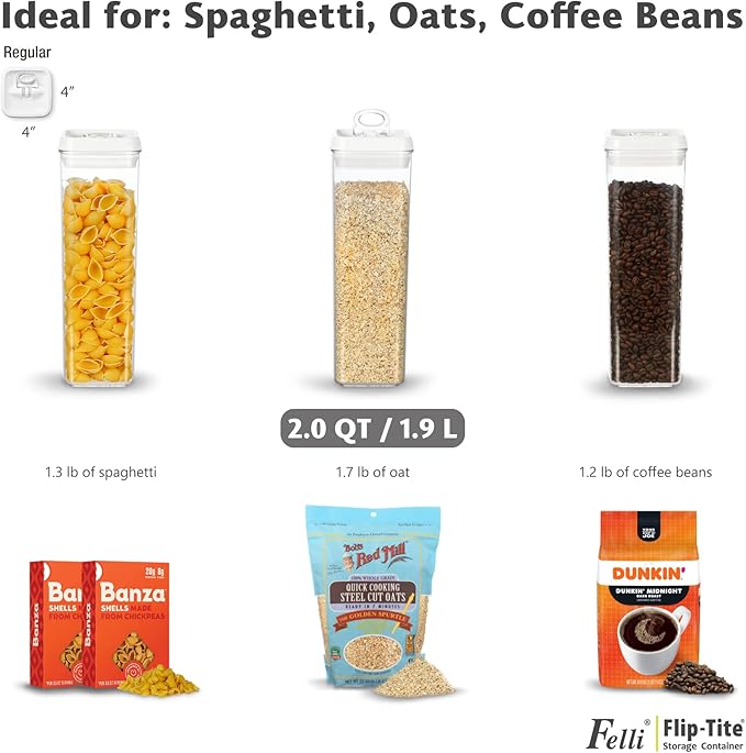 - AVAILABLE IN VARIOUS SIZES & SHAPES: The Felli Flip-Tite container comes in a variety of sizes and shapes to meet different food storage needs. The 4" REGULAR and RECTANGULAR sizes are perfect for organizing small kitchen counters and pantries, making handling and pouring easy. The 5" LARGE size is ideal for storing items like sugar and beans that need scooping. The 6" XL size is specifically designed for storing large quantities of food such as rice, powder, and flour, which require measuring spoons. We offer a versatile storage solution to suit all your needs.