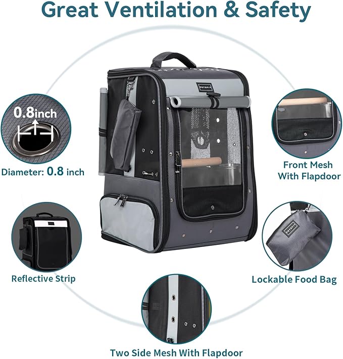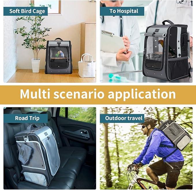 - Our bird carrier backpack fit for cockatiel, african grey, parrot and other birds with long tail, so before you purchasing it, please measure size of birds carefully. There are belt for suitcase use, also used for fastening to the car seat with safety belt.