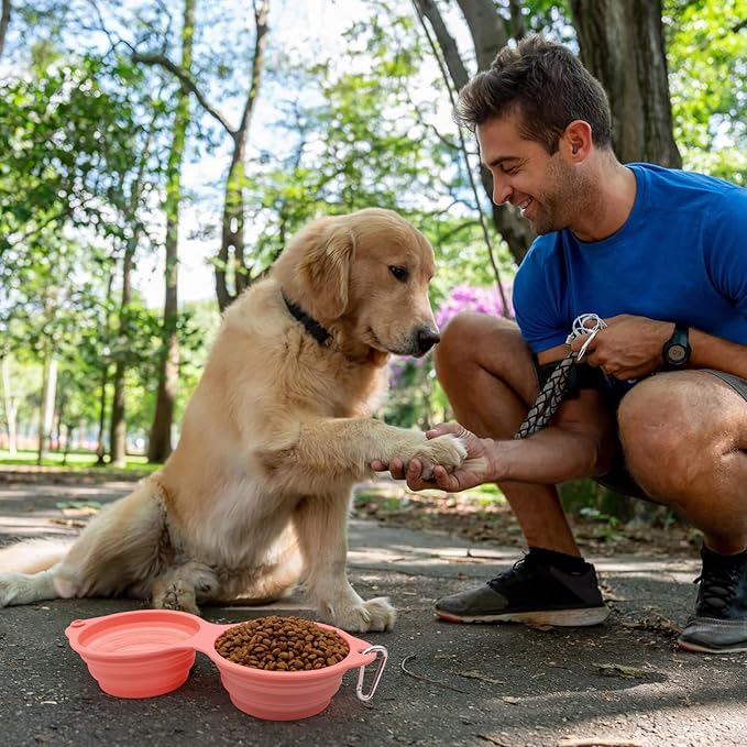 - INTEGRATED MOLDING DUAL BOWL: 2 IN 1 special designed collapsible dog bowls,feed your pets with food & water at the same time.Fold up the double bowls together, portable and more compact, save your space when travelling, walking with your dogs.