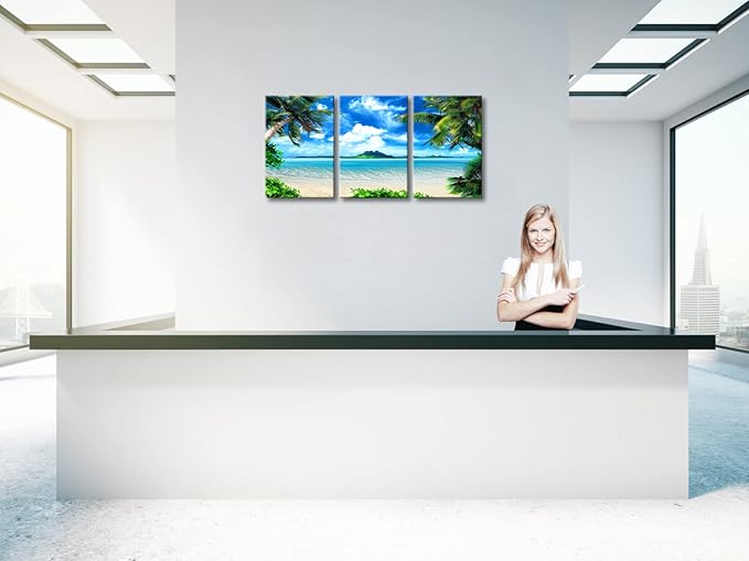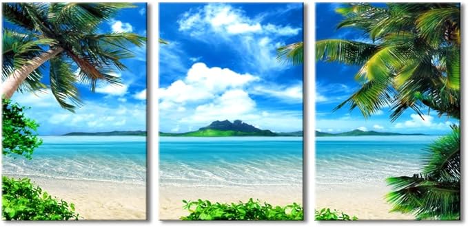 Wieco Art 3 Piece Blue Sea Beach Canvas Prints Modern Stretched Wall Art Seascape Pictures Paintings for Living Room Bedroom Home Decorations Modern Landscape Artwork