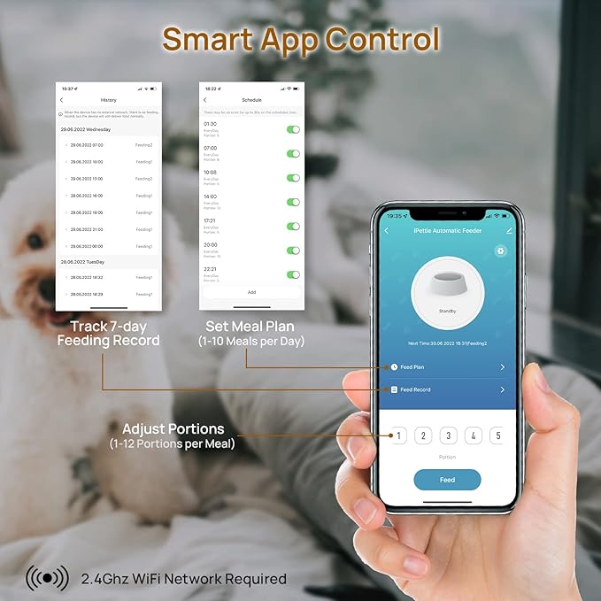 - App Control: Feed your pets anytime and anywhere by using the smart control app. Set 1-10 meals per day with 1-12 portions per meal. Track feeding records and share the device with multiple accounts. The auto cat feeder dry food supports 2.4GHz network only.