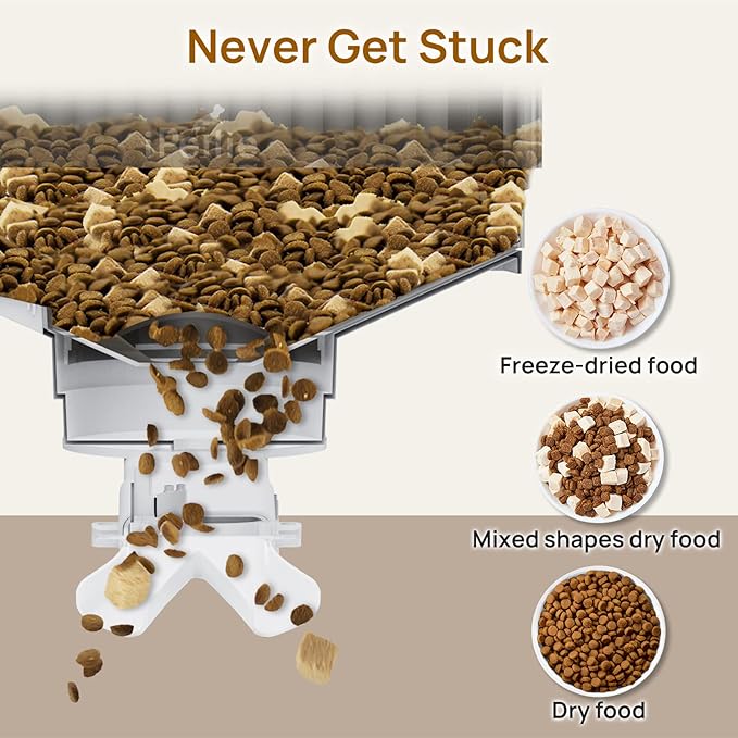 - Never Get Stuck: Equipped with a large torque motor, this dual automatic cat feeder eliminates the problem of food jams and missed feedings. Only use dry kibbles or freeze-dried food between 0.12”-0.51” (3mm-13mm) in size for best results.