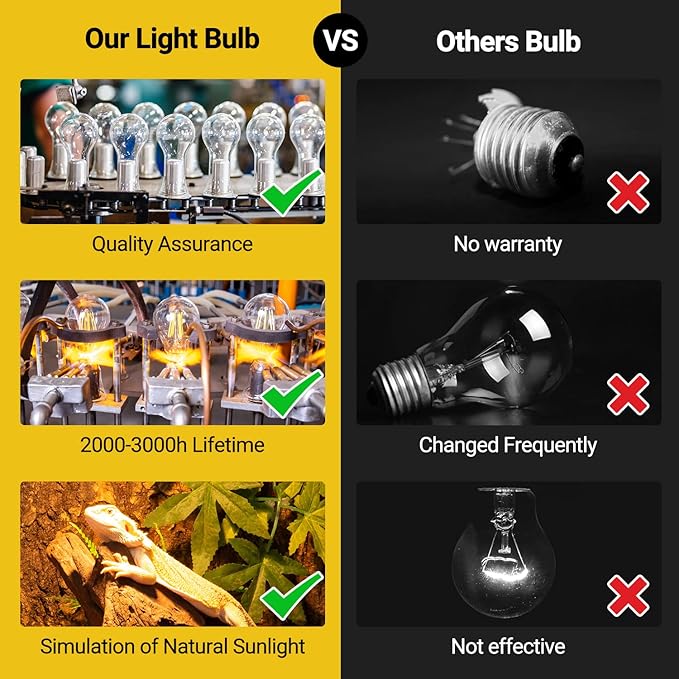 - 【Long Service Life】Adopt updated vacuum aluminizing process technology, the efficiency of the heat lamp bulb increase by 35% and save more energy. Good quality results from upgraded process and the reptile heat lamp can be used over 2000 hours, max 3000 hours.