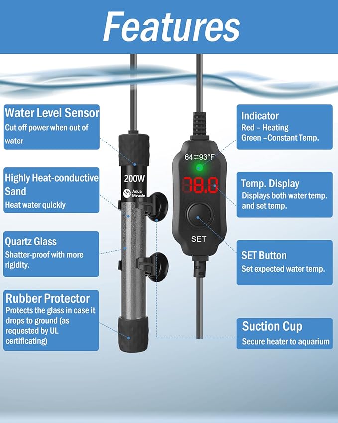 AquaMiracle Adjustable 200W Aquarium Heater Submersible Fish Tank Heater Super Short Aquarium Heater with LED Digital Display Thermostat, for Tanks 20-40 Gallons