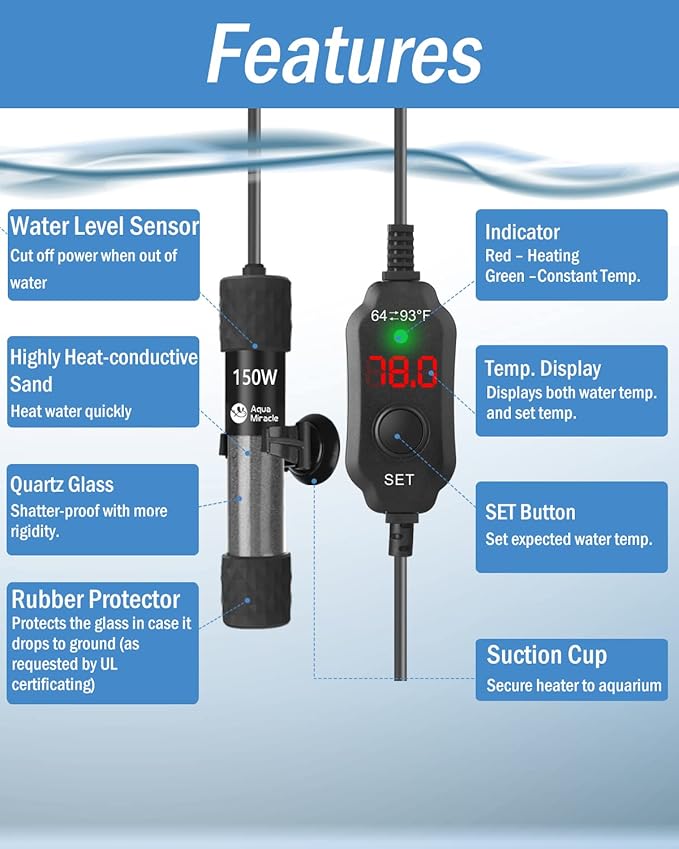 AquaMiracle Adjustable 150W Aquarium Heater Submersible Fish Tank Heater Super Short Aquarium Heater with LED Digital Display Thermostat, for Tanks 15-30 Gallons