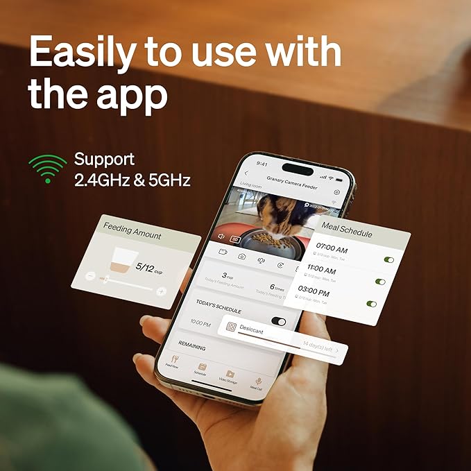 - Smart APP Control: Petlibro automatic cat feeder is 5GHz and 2.4GHz WiFi-enabled, allowing you to program and monitor your pet's meals anywhere anytime through the PETLIBRO App for iOS and Android phones. You can set a feeding plan, and schedule feeding time, up to 10 meals per day with 1-50 portions per meal. Check the feeding logs to rest assured your pet gets fed on the set schedule. The feeder can be controlled by multiple family members' smartphones