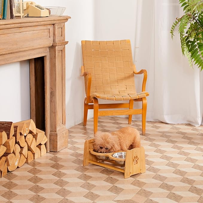 - Stable Anti-Skid: raised dog food bowls is made from Natural high quality bamboo.The dog feeding station with anti slip feet make it stable and does not slide easily, it prevent your pet from sliding bowls around and provide protection for your floors. Increases Anti-slip feet on bowl insets which eliminated the impact sound when pets are eating.