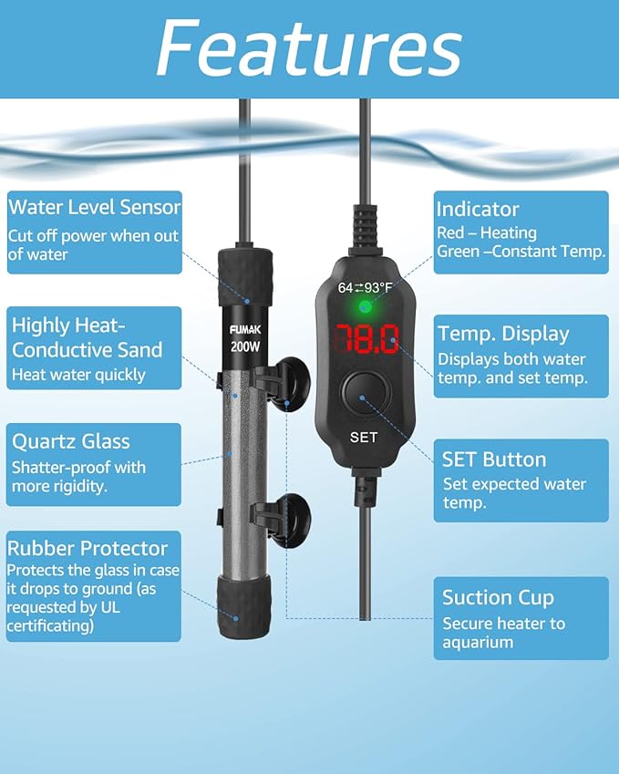 - SUPER MINI SIZE – This aquarium heater is SUPER SHORT in length – might be the shortest heater in the market! It is only a bit more than HALF of the length of the traditional aquarium heaters! The innovative super short length perfectly solves the headache of the fish keepers on the traditional aquarium heaters! Takes up less space, easy to hide, but in full power! Temperature range is 64-93F. 200 Watt for 20 -40 Gallon tanks.