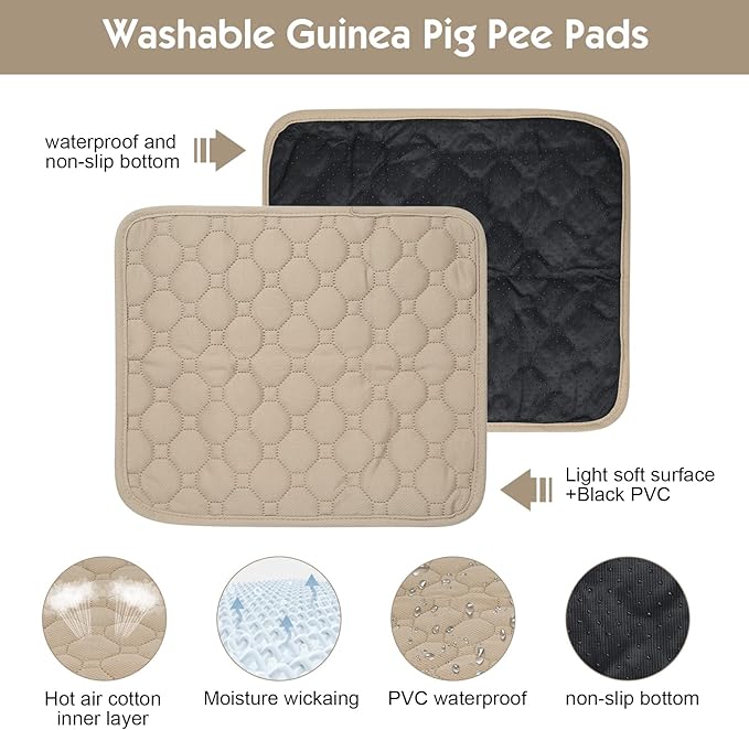 - Absorbent Fleece Cage Liners: This guinea pig hideout is also equipped with a super-absorbent urine pad which protects the cage or floor from urine and droppings. The urine pad can be used many times and is made using a comfortable and soft fabric.