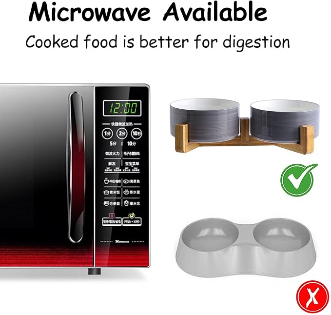 - EASY TO CLEAN CERAMIC - This easy clean dog bowl set is dishwasher proof, as well as easy to handwash and wipe down. With thick walls, these ceramic bowls for pets are sturdy, leak-free and weighty yet not too heavy. Double Bowl Design:One dog bowl for food and one for water, Each ceramic cat bowl has a Unique wooden stand, raising the dishes closer to your pet for more comfortable eating