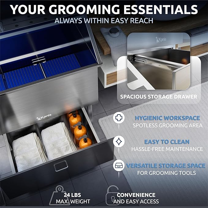 - SPACIOUS STORAGE & HYGIENIC SETUP: The sliding drawer holding up to 24 lbs, provides generous space for grooming tools and accessories. Keep essentials within reach while maintaining a clean pet wash station with hassle-free upkeep