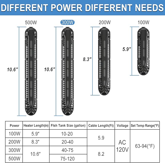 - 【Aquarium Heater 300W】-- The 300 watt aquarium heater produces stable power with quick heat up. It's length is 10.6'', voltage 110-120V, power cord is 8.2ft (cable cord length: 4.6 feet, power cord length: 3.6 feet) . Aquarium heater for 40 to 75 gallons, ideal uses for the marine saltwater and freshwater, fish tanks, turtle tanks, betta tanks, small ponds, and so much more.