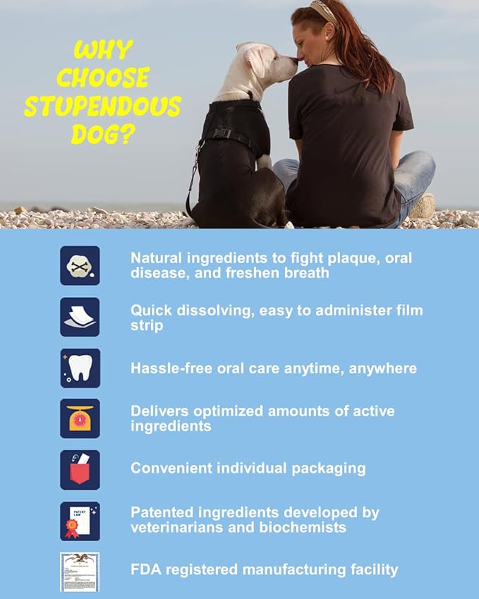 - DOG BAD BREATH ELIMINATOR: Say goodbye to canine halitosis with Stupendous Dog Breath Freshener Supplement Strip. With our patented blend of natural ingredients, your puppy's breath will smell fresh and clean after just one treatment. No more hassling with doggie toothpaste and toothbrushes, mouth wipes, or sprays!