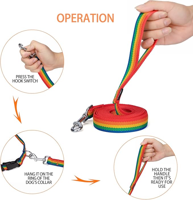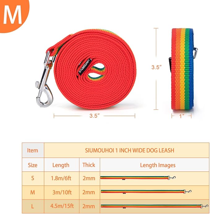 Strong Durable Nylon Dog Training Leash, 1 Inch Wide Traction Rope, 6 ft 10ft 15ft Long, for Small and Medium Dog (Rainbow, 10 Feet)