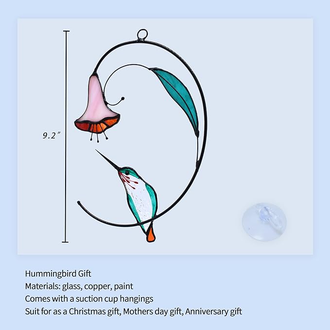 Lolitarcrafts Hummingbird with Flower Stained Glass Suncatcher Bird Stained Glass Window Hangings Hummingbird Gift for Home Decor (Green)