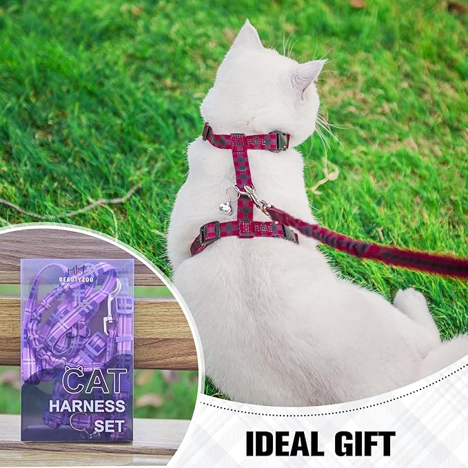 BEAUTYZOO Cat Harness and Leash Set Escape Proof for Walking, Kitten Soft Adjustable Vest Harnesses for Small Medium Large Cats, Easy Control Breathable Plaid Ribbon Nylon for Outdoor Indoor Use