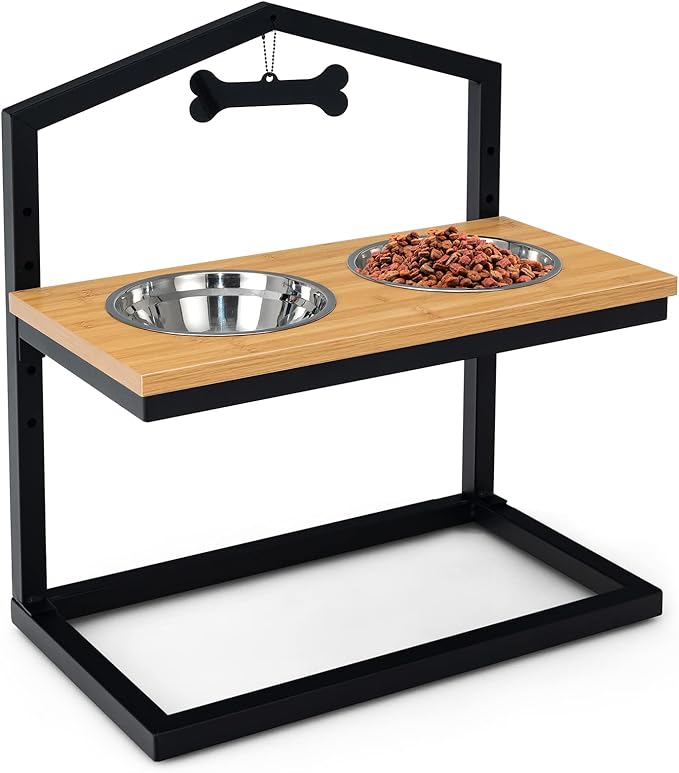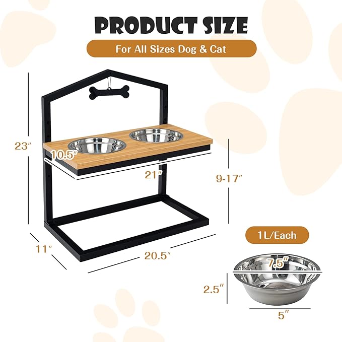 - EASY TO ASSEMBLE -- 【Just 5 Steps】: With detailed instructions and all accessories, this adjustable dog bowl holder can be easily put together without much time and effort. All you need to do is attach the platform to the stand, hang the name tag and put on stainless steel bowls. In just 5 steps, a stylish pet feeding station will appear in front of your eyes.