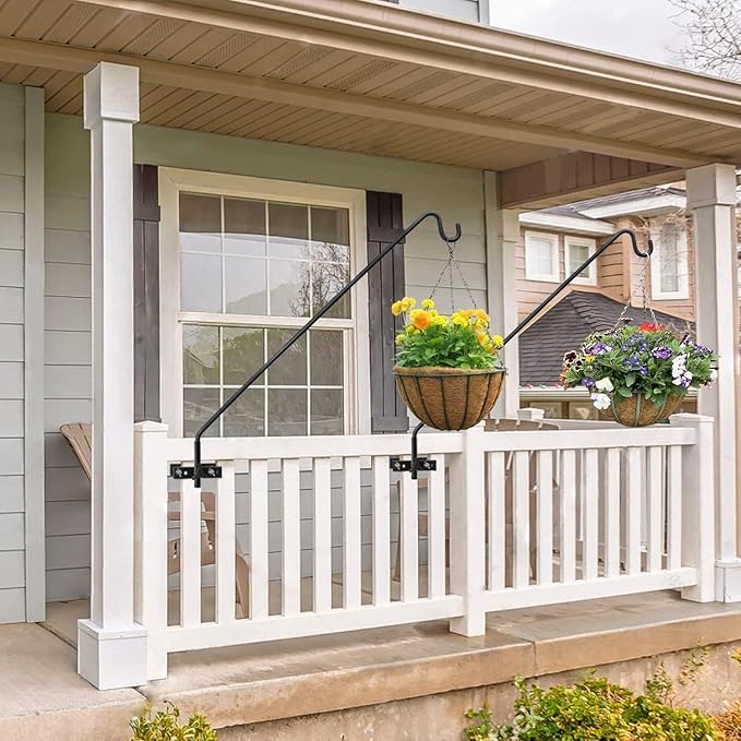 - High Quality Railing Hooks: The shepherd hooks for decks are made of heavy duty steel. The surface is coated with a black powder coating, which can be used outdoors for a long time even in bad weather and is not easy to rust. The sturdy brackets and curved rod tips help securely hold items in place.