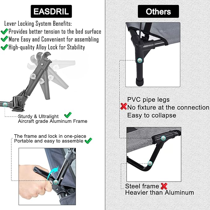 - Fewer Parts & Easy to Assemble: No screws and accessories. This folding dog bed contains only 4 parts - 2 aluminum tubes, 2 lever locks,1 nylon mesh surface, and 1 carry bag. The aluminum tubes are combined with elastic cords for easy assembling and storing. The lever locking system is convenient and robust. Only takes 3 steps for setting up in a new place