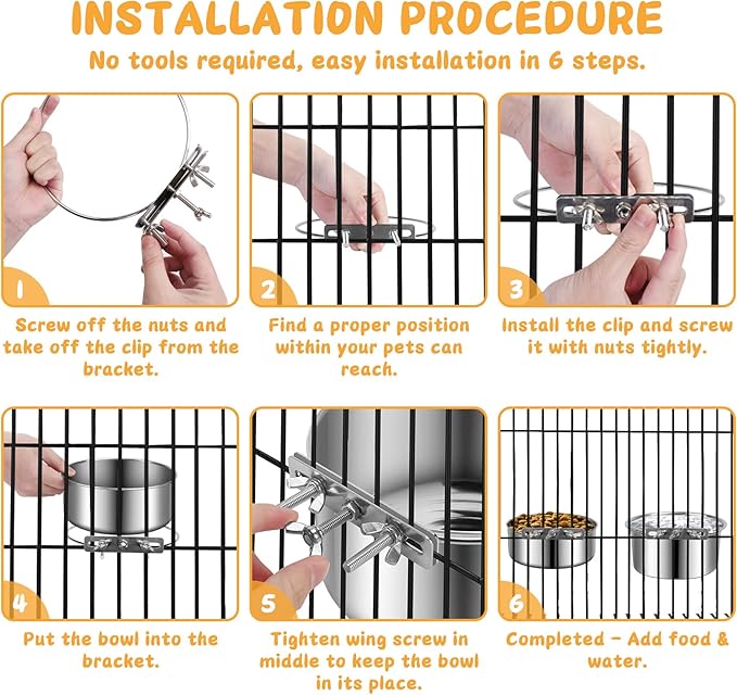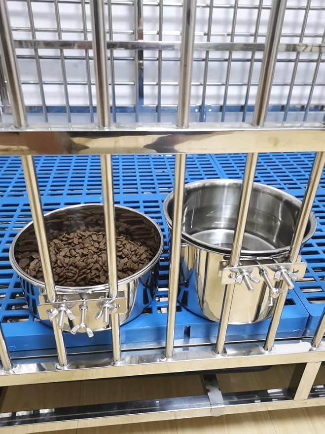 - 【Anti-Spill】 Wide-mouth design with a ring bracket helps water bowl and food bowl to reduce spilling. The middle wing screw can lock the bowl securely in its place, you don’t need to worry the bowl will tip over resulting in your pets being wet or messy in cage. Heavy duty for medium and large destructive dogs.
