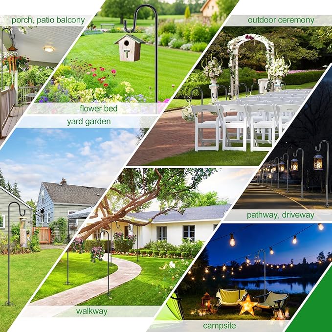 - Wind-Resistant with Deep U-Curved Hook :The deep U-shaped shepherd’s hook reduces swaying, keeping your hanging feeders or decor secure - even in strong wind. Ideal for outdoors, no more worrying about blown-away items during storms