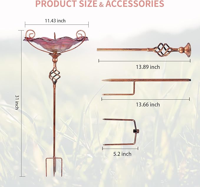 - 【Bird Bath Dimensions】 Height: 31inch, Width: 11.4inch. Bird bath is made of a handmade glass bowl with a wavy edge design; a gorgeous addition to any lawn, flower bed, garden, patio, or outdoor space. Perfect to invite your feathered friend to enjoy it as bird bath or birdfeeder