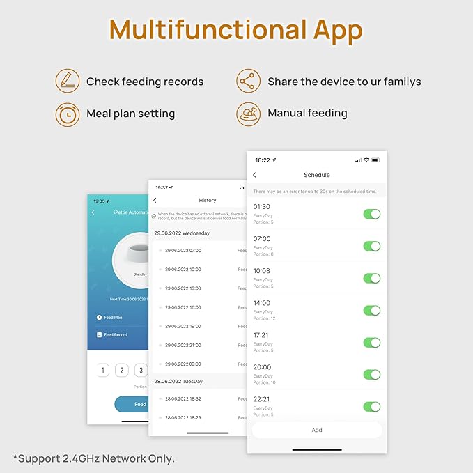 - App Control: Feed your pets anytime and anywhere by using the smart control app. Set 1-10 meals per day with 1-12 portions per meal(1 portion=10g±2g). Track feeding records and share the device with multiple accounts. The auto cat feeder dry food supports 2.4GHz network only.