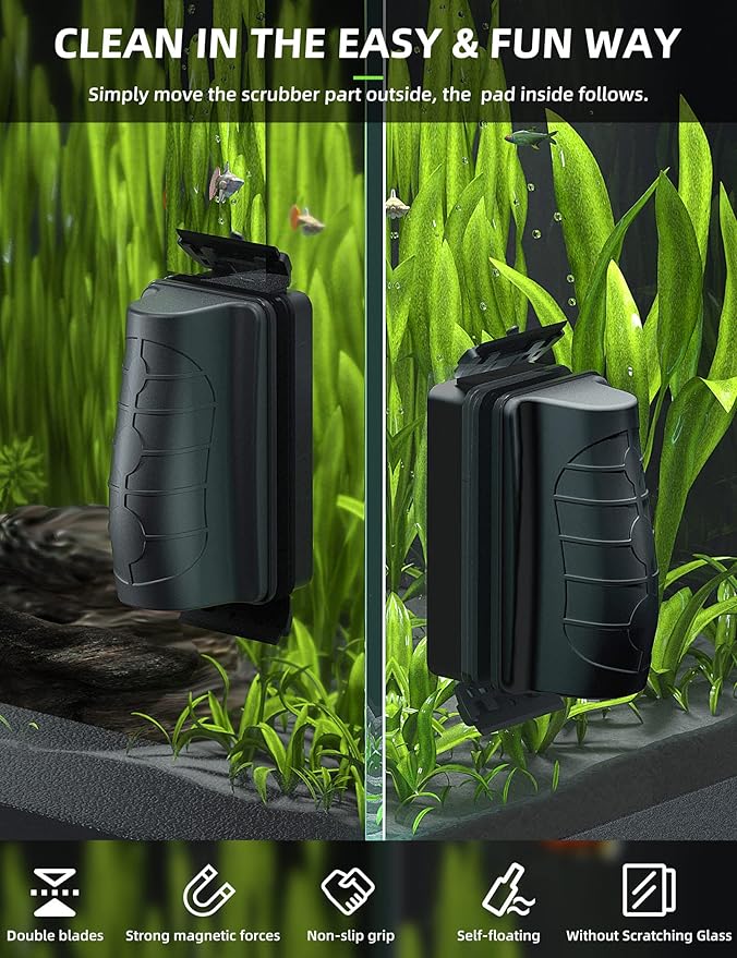 - Simply move the no-scratch, felt-lined handle and inside your aquarium, the scrubber follows, cleaning as it goes