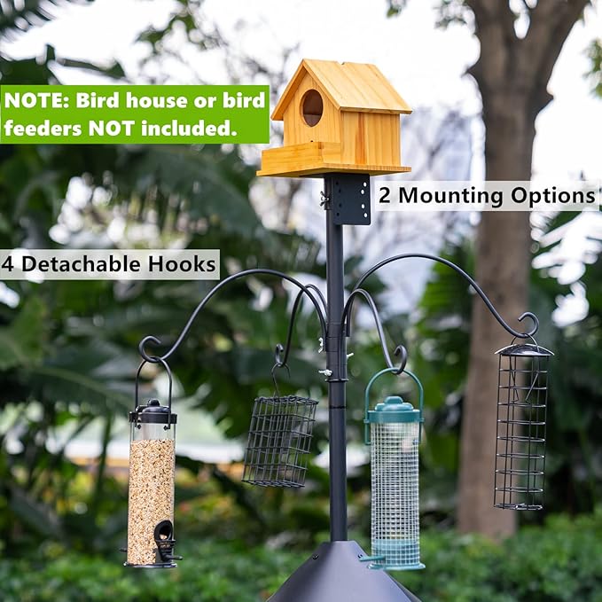 - DURABLE CONSRTUCTION: We’ve upgraded the bird feeding station with high temperature queching steel coated with rust-resistant powder which provides added stability. Coming with 5 detachable prongs,it provides a strong and stable base that will withstand the test bad weather. NOTE: Bird house/feeders are NOT included.
