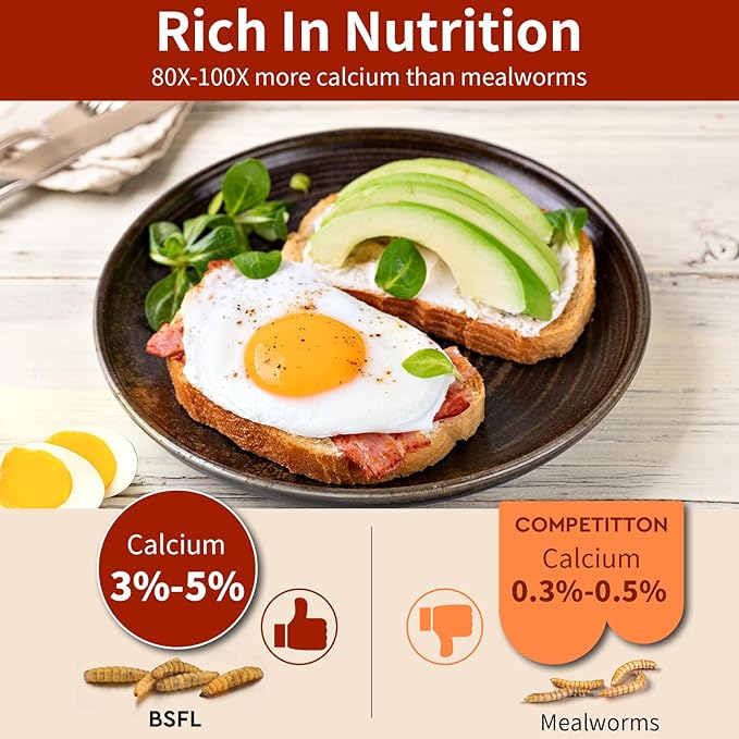 - Rich in Calcium: Dried black soldier fly larvae are rich in calcium, with up to 85X more calcium than mealworms, which can help hens lay eggs with stronger eggshells, making it a favorite snack among hens. Additionally, our BSFL is easily digestible, ensuring optimal nutrient absorption for your chickens