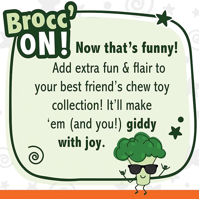 - Brocc' On - We dog-ified broccoli to create an exciting chew toy for large dogs that will add extra fun and flair to your best friend's chew toy collection