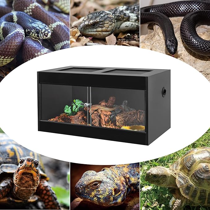 - 【Heat Preservation Better than Glass】Compared to glass terrarium, this thickened wooden reptile enclosure provides excellent heat insulation, more in line with natural reptiles environment. Black and non-reflective surfaces reduce stress in your pets.
