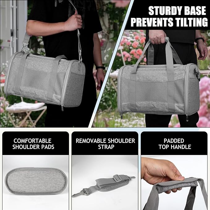 - [Comfortable and Safe Design] Our pet carrier is designed with 4 breathable mesh windows to ensure proper ventilation. It has a top load, and 2 side entryways with antiescape zippers ensure safety. The strong and adjustable shoulder strap can also be used as a seatbelt. A back strap is designed to secure the cat carrier to your suitcase or luggage.