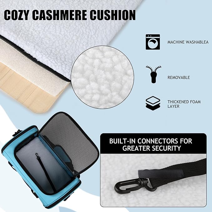 - IDEAL TRAVEL CARRIER-The pet carrier comes with a removable base insert,which creates a solid surface for your pet to stand on,along with a removable & hand washable cozy fleece pet bed,which offers a cozy sleeping space for your traveling pet.