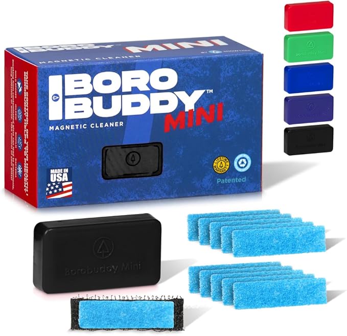 - ✅ COMPACT SIZE - We revolutionized glass cleaning with the original BoroBuddy Pro magnetic glass cleaner. Now we've created a compact version that can fit harder to reach places, grooves and smaller glass pieces. The SnowTree BoroBuddy handle measures 1.5" x 1" with an inside cleaning surface of 1" across. Includes 11 replacement cleaning pads.