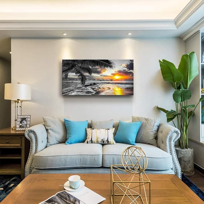 Yxbhhym-Beach Wall Art Black and White Ocean Pictures for Walls Sunrise Seascape Scenery Canvas Print Sunset Painting Palm Poster Sea Wave Artwork for Living Room Wall Art Bedroom Office Wall Décor