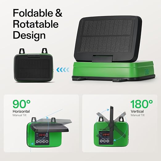 - Automatic Solar Watering: The automatic watering system is powered by solar energy and draws water directly from a container without power cord or faucet; The solar panel uses new PET lamination technology and UV-resistant material for better performance; The solar panel can be folded 90° up and down and rotated 90° left and right to better receive light