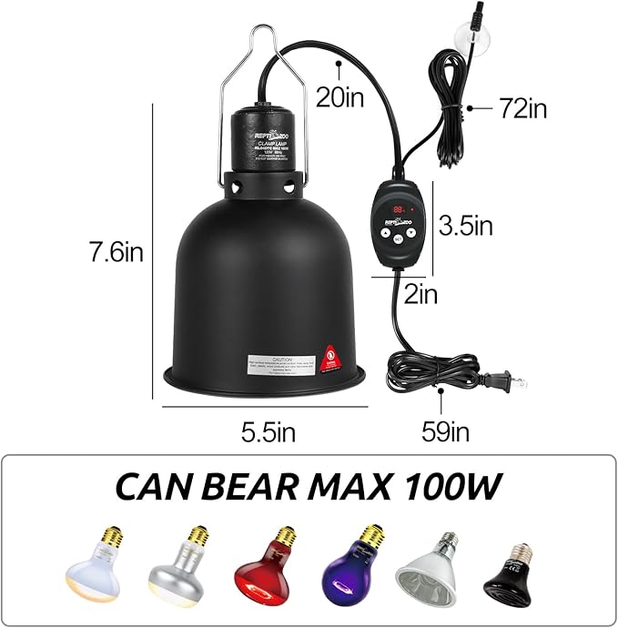 - 【Great Value】REPTIZOO reptile light fixture with dimming thermostat is great for helping you create a suitable temperature range for your pets. The reptile fixture is ETL certified, apply E26 ceramics lamp cap, can bear Max 100W. (Heat bulbs NOT included )