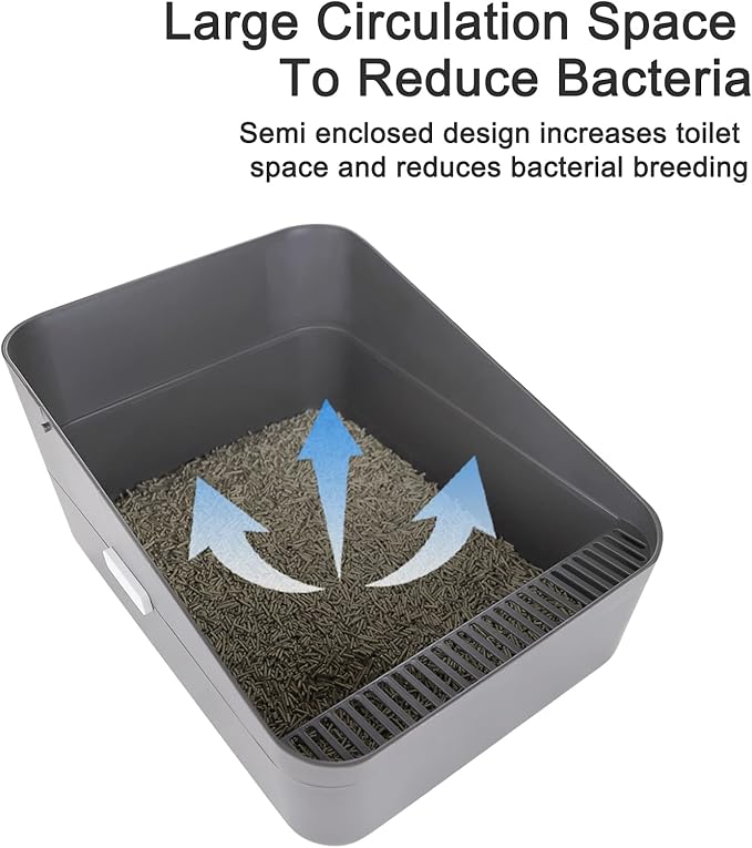 - Raised Enclosure: Litter box features a double barrier design with a high level fence to prevent urine leakage. The raised, streamlined fence design caters to the natural habit of cats of frequent entry and exit. It also prevents cats from jumping out and bringing out litter and urine, keeping the litter contained within the box. It is also easy to lift and move the litter box, giving you a clean home environment.