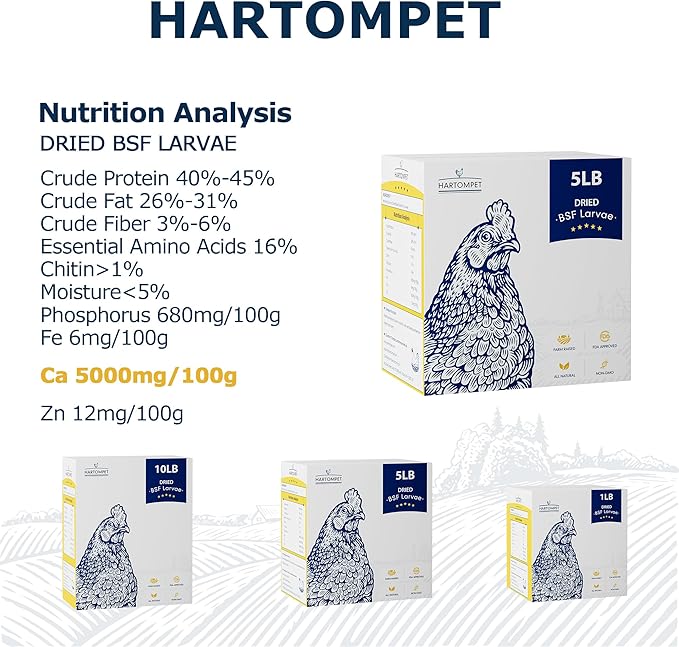 - Calcium Boost: Dried Black Soldier Fly Larvae, with 85x more calcium than mealworms, promote strong eggshells and support poultry health.