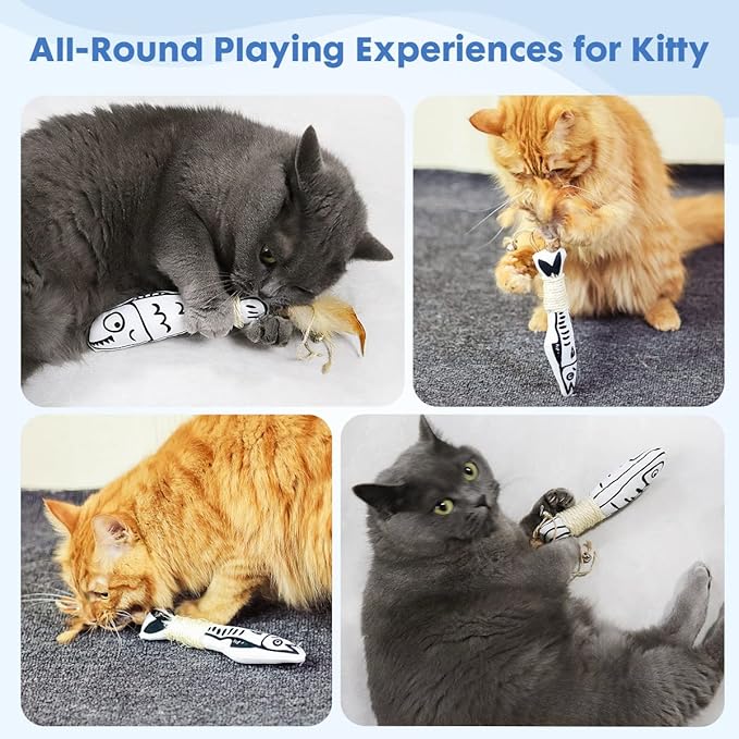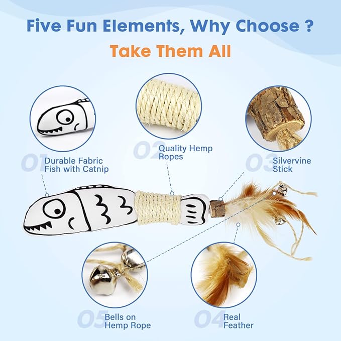 - ❤❤ A all-in-one toy combination of cats' favoriate 6 play elements , Catnip , silvervine ,bells, fish , feather , ropes,No need to choose , just enjoy them all in one toy .