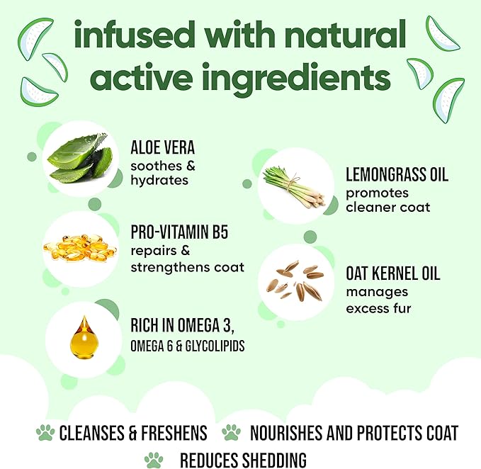 - Product Benefits : Helps minimize shedding, promotes healthy skin, and nourishes the coat with a blend of omega 3 & 6, glycolipids, aloe vera, lemongrass, and pro-vitamin B5. Helps minimize shedding, promotes healthy skin, and nourishes the coat with a blend of omega 3 & 6, glycolipids, aloe vera, lemongrass, and pro-vit… See more
