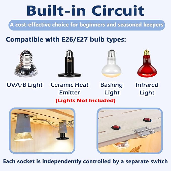 - 【Built-in Bulb Sockets】Featuring two built-in bulb sockets (three in the 40&48-inch version) compatible with E26/E27 heat bulbs, night lights, and more (bulbs not included). Easily set up your lighting for the perfect reptile habitat.