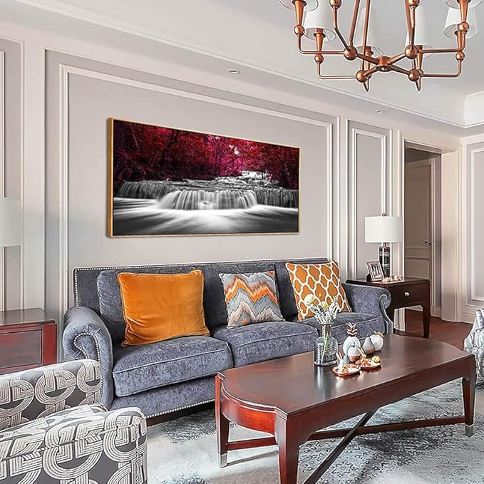 Lasdel Natural Extra Framed Canvas Wall Art of Wide Waterfall & Red Leaves Picture For Bedroom,Burgundy Nature Black White Artwork Decor,Beautiful Maple Leaves Landscape Print Painting,30x60