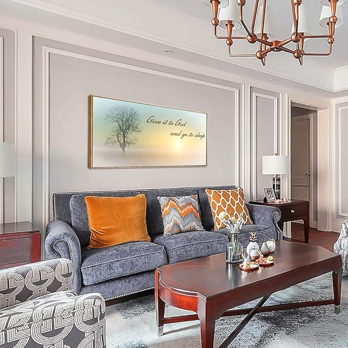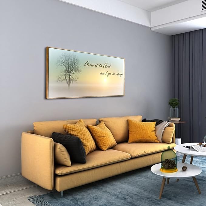 Lasdel Natural Extra Framed Wall Art of Misty Sunset & Tree Plant Picture For Bedroom Home Above Bed,Large White Country Wood Sign For Bathroom,Give It To God & Go to Sleep Artwork Decor,24x48