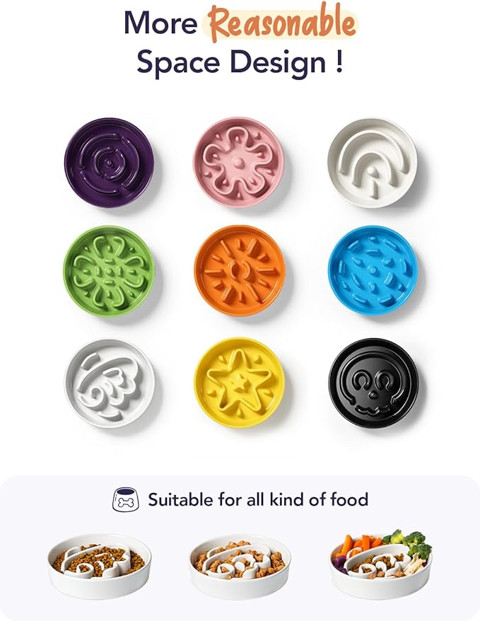 - Slow Down Eating, Bring Dog A Healthy Diet: Fast-eating dogs experience bloat, regurgitation, and obesity easily. Our slow feeder dog bowl design with the ridges and maze pattern helps your dog to eat slower than 10 times. Your dog could change his overeating behavior through a challenge and fun mealtime