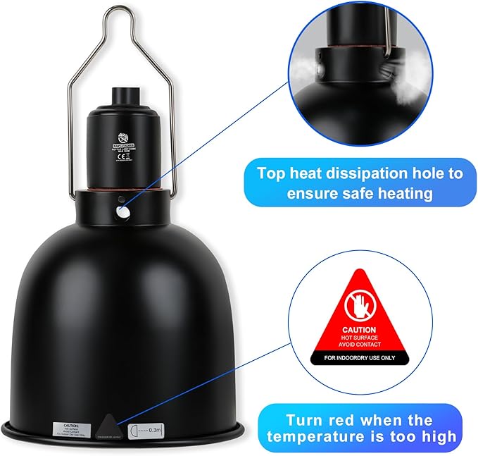 - 【Good Heat Dissipation】:The top vent of heat lamp kit has good heat dissipation effect, this design prevents excessive heat buildup and reduces the risk of reptile burns while providing your reptile pet with basking spot light.