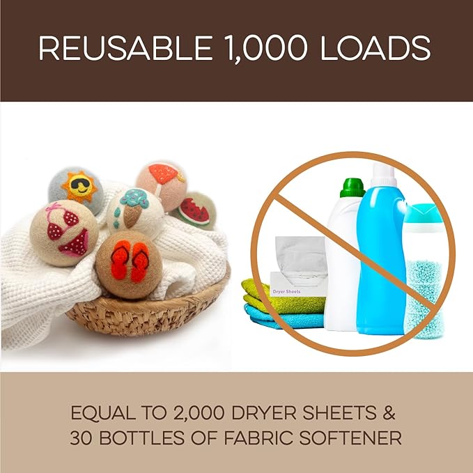 - REUSABLE FOR 1000+ LOADS β REDUCE WASTE: Why keep buying disposable dryer sheets? These cute dryer balls last 1000+ loads, replacing 2000 dryer sheets or 30 bottles of fabric softener. Fluff Ewes dryer wool balls laundry reusable deliver a cost-effective solution for 2-4 years of hassle-free laundry. Make a smarter choice for your wallet and the environment.