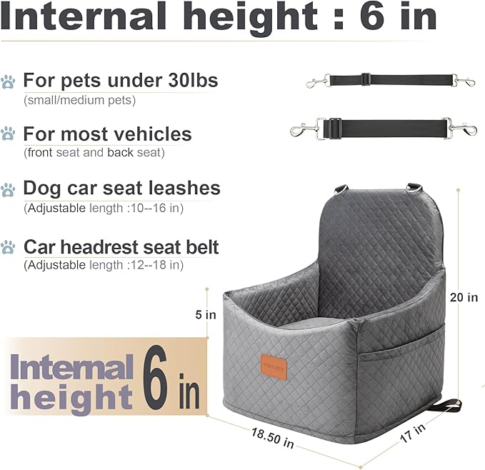 Youvee Dog Booster Seat,6 Inch Elevated Pet Seat for Small Dogs Up to 30 lbs,Front & Back Seat Booster for Dogs,Safety & Comfort,Detachable & Washable(Grey)