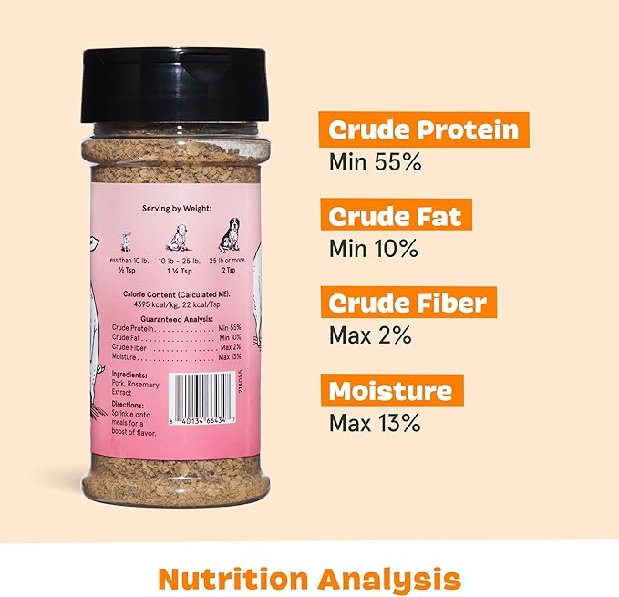- Limited Ingredients: With only two ingredients - pork & rosemary, this product is ideal for health-conscious dog owners. Catering to both large and small breeds, it complements your pet's dry dog food seamlessly, offering a natural dog treat option sprinkled over the dog bowl.